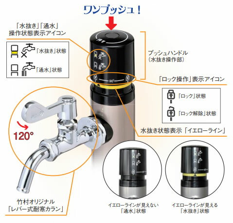 〇「水抜き」「通水」操作状態が一目でわかるアイコン表示。