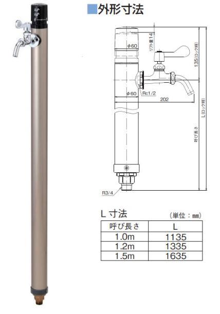 ■仕様 ・型式:D-MU ・吐水口径:13mm ・本体接続口径:20mm ・呼び長さ:1.2m ・主要材質 本体:CAC406 立上り管:SUS304 外筒:A6063TE ・配管接続:テーパおねじ ・外筒カラー:シャンパンゴールド(CG) ・使用流体:水道水 ・使用温度:60℃以下 ・使用水圧:0.75MPa{7.6kgf/cm2}以下 ・付属品:レバー式耐寒カラン(KTL-10U)