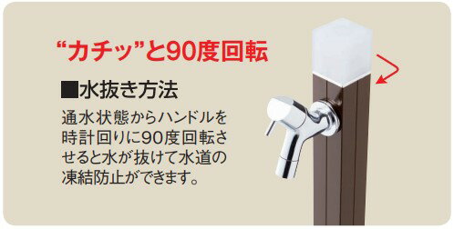 〇水抜きハンドルを90度回転操作するだけで凍結防止ができます。