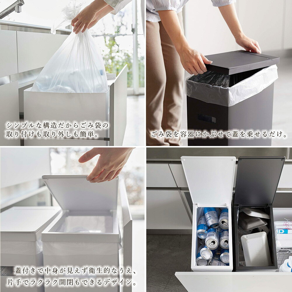 シンプルな構造だからゴミ袋の取付けも、取り外しも簡単! ゴミ袋を容器にかぶせて蓋を乗せるだけで、中身が見えず衛生的なうえ、片手でラクラク開閉もできるデザインです。