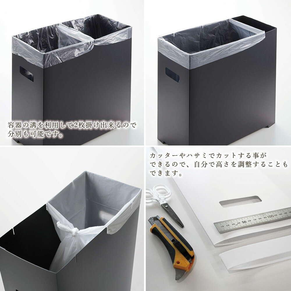 ゴミ箱2つを使っても、ゴミ箱の中で袋を分けても、生ごみ・プラスチックゴミ、ビン・カン・ペットボトルやトレー、ペーパーなどの分別が出来るので便利! カッターやハサミでカットすることができるので、自分で高さを調整することもできます。