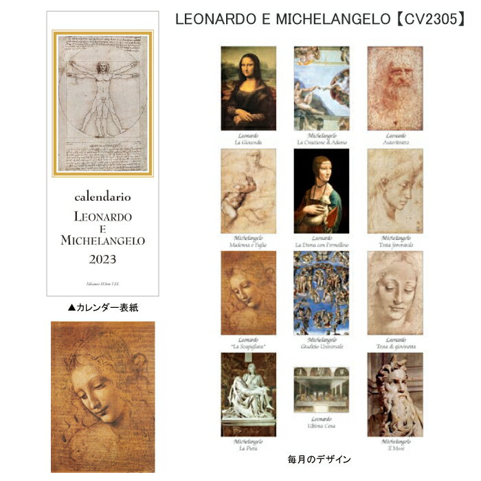 商品名2023年度版 壁掛けカレンダー(縦長) LEONARDO E MICHELANGELO CV2305サイズ13.5×34cm (リング綴じタイプ)商品詳細表記:イタリア語/英語 祝祭日等の表示なし※日曜日のみ赤字表記生産イタリア製 MADE IN ITALY商品説明レオナルド・ダ・ヴィンチとミケランジェロの絵画や彫刻、スケッチを集めた、縦型の壁掛けカレンダー。